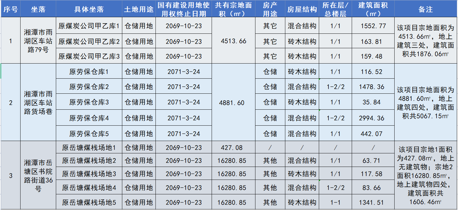 二、項(xiàng)目介紹 項(xiàng)目一:湘潭市雨湖區(qū)車(chē)站路79號(hào)原煤炭公司甲乙?guī)?/strong> 項(xiàng)目位于湘潭市雨湖區(qū)車(chē)站路79號(hào)(廣云路口),地處雨湖區(qū)中心城區(qū),毗鄰湘潭火車(chē)站,位于基建營(yíng)核心商圈,有產(chǎn)權(quán)的房屋面積共1876.06㎡,宗地面積4513.66㎡,工業(yè)倉(cāng)儲(chǔ)用地,國(guó)有出讓性質(zhì)。
