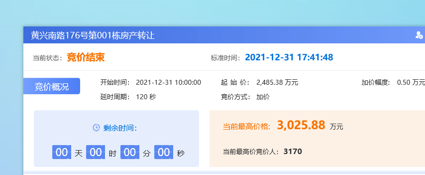 長沙聯(lián)交所在接洽該項目時,委托方要求趕在年底前完成資產(chǎn)處置,時間緊任務(wù)重。受理項目后,長沙聯(lián)交所迅速行動,全力搶抓時間節(jié)點(diǎn),組織專業(yè)團(tuán)隊對標(biāo)的物現(xiàn)狀進(jìn)行全方位調(diào)查,充分掌握房產(chǎn)的相關(guān)信息;為項目啟動“綠色通道”,加快掛牌資料的審核并積極協(xié)調(diào)各方,在最短的時間內(nèi)完成項目掛牌。項目掛牌后,長沙聯(lián)交所又針對項目情況定制招商方案,通過公司官網(wǎng)官微、投資人庫精準(zhǔn)推薦等線上線下多渠道廣泛宣傳,征集到多名意向受讓方。面對意向受讓方的多番咨詢,安排專人講解,協(xié)助客戶完成前期報名等手續(xù),提供全天候無差別優(yōu)質(zhì)服務(wù)。網(wǎng)絡(luò)競價當(dāng)天,意向競買人熱情高漲,從上午10點(diǎn)到下午5點(diǎn)41分,歷時7小時41分,競價輪次高達(dá)428次,最終以3025.88萬元順利成交,超出掛牌價540.5萬元,溢價率21.7%。